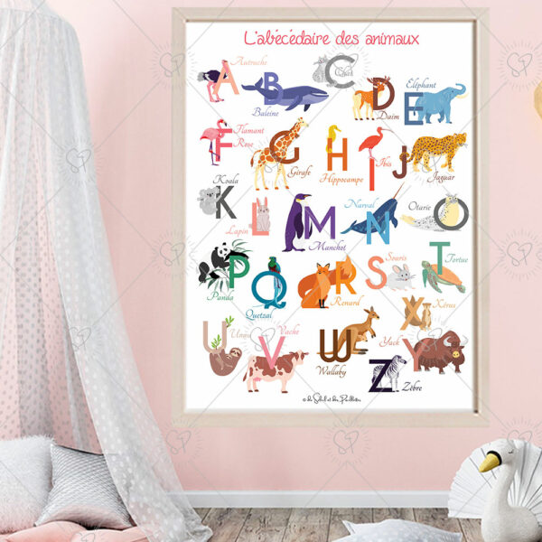 Décorez la chambre de votre enfant avec cet abécédaire sur le thème des animaux. Une jolie affiche à offrir à un enfant qui rentre à l’école. De quoi apprendre l’alphabet de manière ludique. Possibilité de personnaliser la couleur du titre.