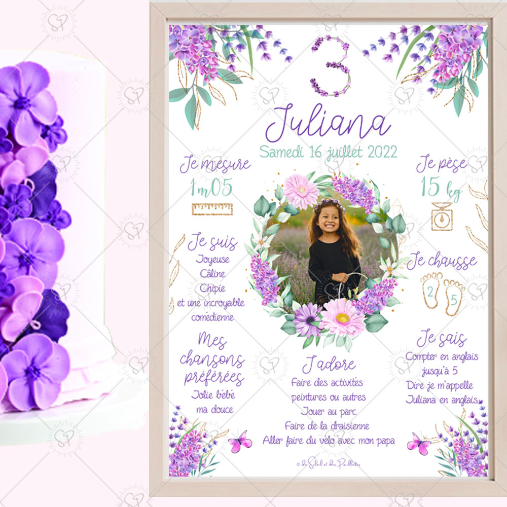 Célébrez l’anniversaire de votre enfant avec cette affiche personnalisable couleur lilas et son ambiance champêtre . Un souvenir qui retrace ses exploits, ses informations clefs comme sa taille ou encore son poids, que vous pourrez ensuite afficher dans sa chambre.