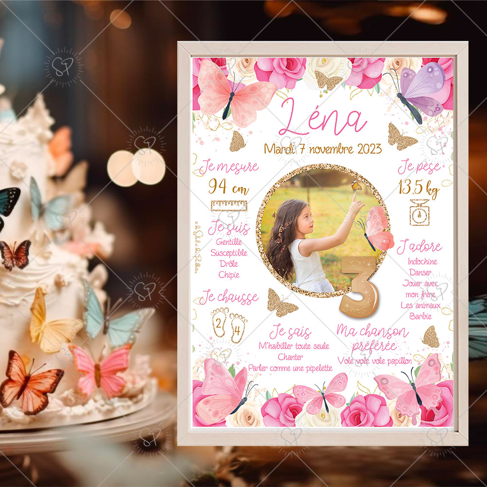 Célébrez l’anniversaire de votre enfant avec cette affiche personnalisable florale et ses papillons. Un souvenir qui retrace ses exploits, ses informations clefs comme sa taille, ses chansons préférées ou encore son poids, que vous pourrez ensuite afficher dans sa chambre.