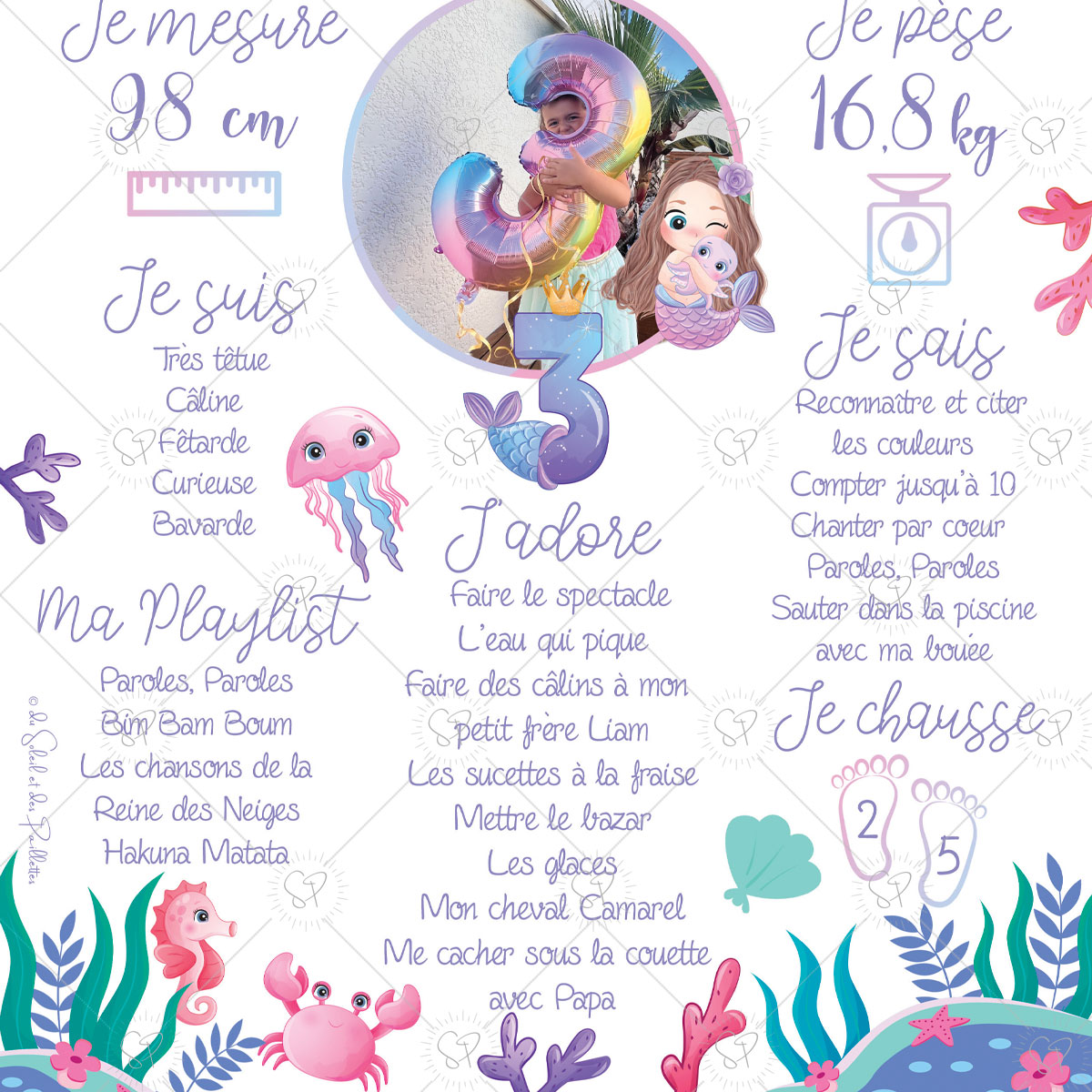 Pour son anniversaire, plongez votre enfant dans un monde enchanteur et sous-marin avec cette affiche anniversaire personnalisée, illustrée de jolies sirènes et de leurs adorables compagnons des océans ! Sur un fond pastel, cette affiche met en lumière les exploits et souvenirs précieux de votre enfant : taille, poids, chansons préférées… Un trésor à conserver et à afficher dans sa chambre, après la fête.