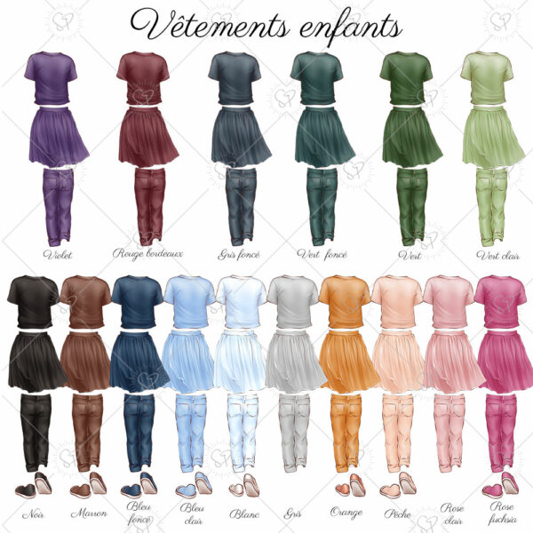 4) petite fille 6 + : prénom / peau clair / cheveux : style 6 – châtain/ t-shirt blanc / jupe bleu / chaussures blanches