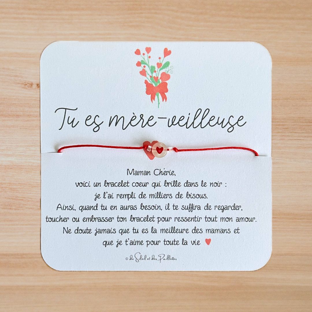 Le bracelet est accompagné d’une petite carte où l’on peut lire « Maman chérie, voici un bracelet coeur qui brille dans le noir : nous l’avons rempli de milliers de bisous. Ainsi, quand tu en auras besoin, il te suffira de regarder, toucher ou embrasser ton bracelet pour ressentir tout notre amour. Ne doute jamais que tu es la meilleure des mamans et que l’on t’aime pour toute la vie ». Existe aussi en version enfant unique.
