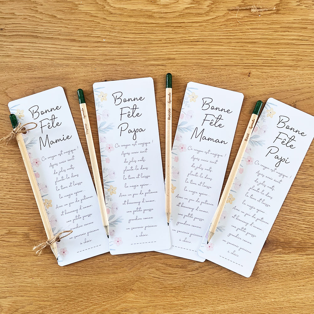 Pour un anniversaire, un départ à la retraite ou encore pour souhaiter bonne fête aux mamies, mamans, papis ou papas, chaque crayon est accompagné d’une carte prête à offrir avec un message doux et un espace pour ajouter le(s) prénom(s) des expéditeurs. Au verso, le mode d’emploi explique comment planter le crayon.