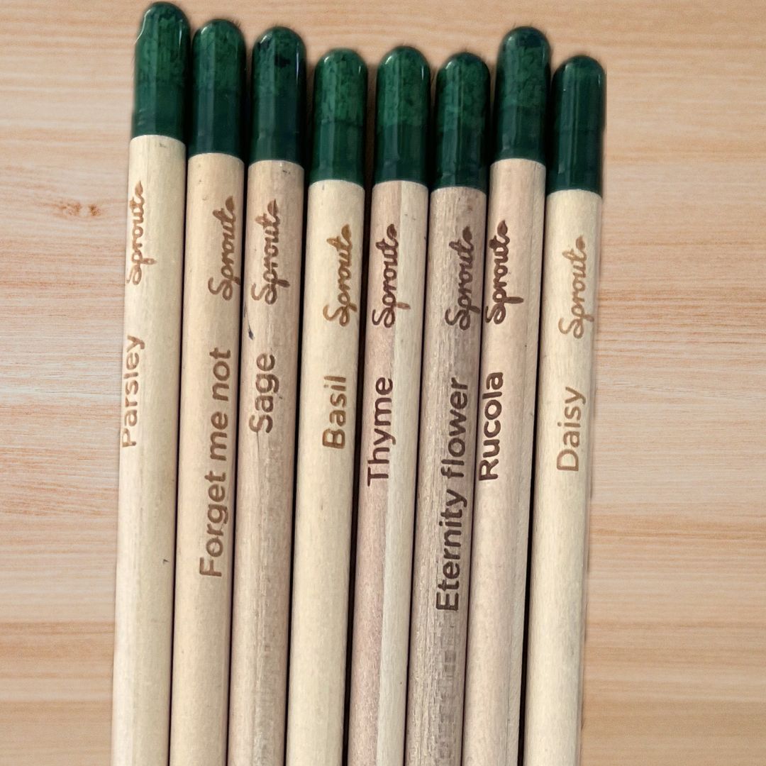 Chaque crayon à planter est gravé avec le nom de sa graine en anglais à savoir Marguerite (Daisy), Immortelle à bractée (Eternity Flower), Myosotis (Forget me not), Sauge (Sage), Thym (Thyme), Basilic (Basil), Persil (Parsley) et Roquette (Rucola) : les graines sont aléatoires.