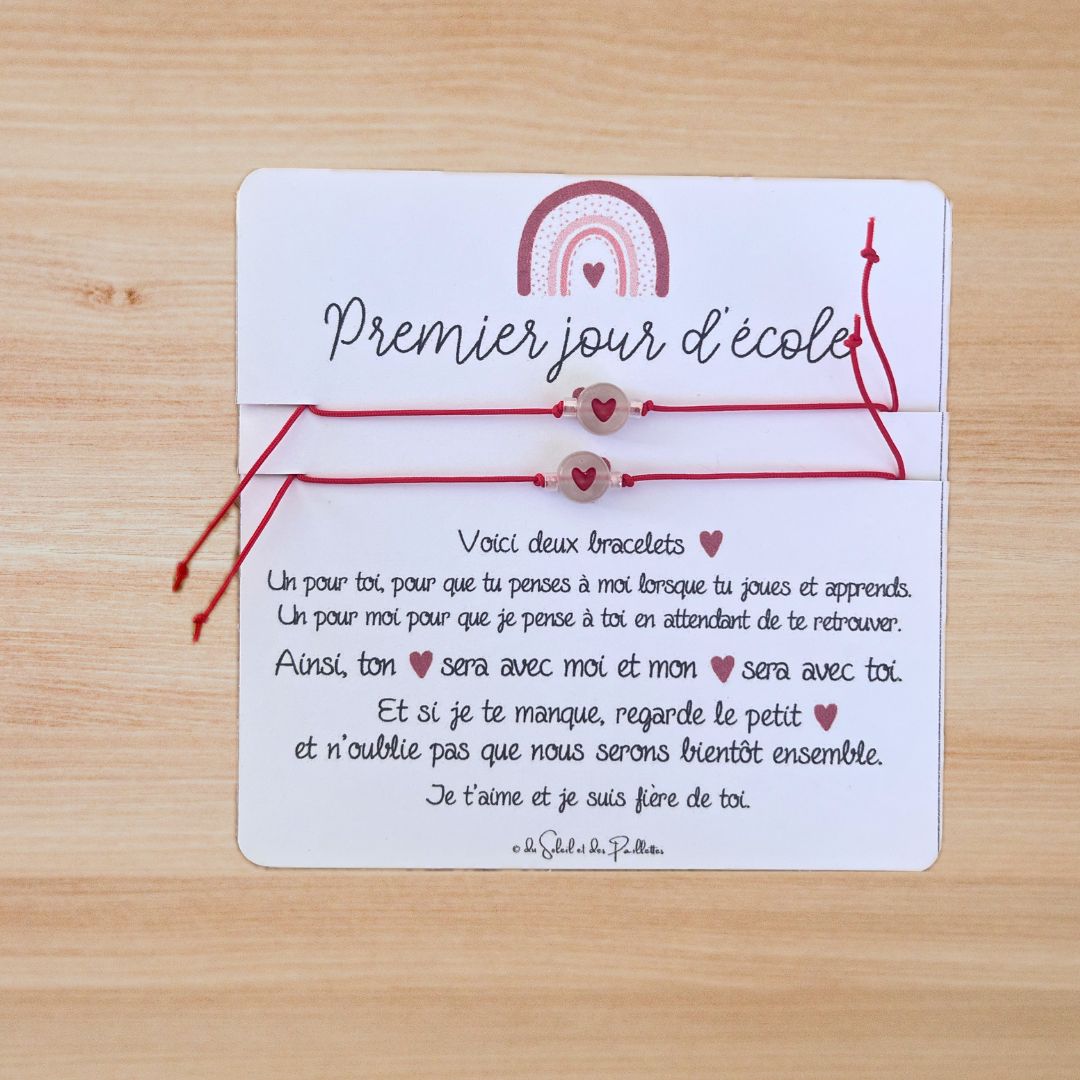 Pour une rentrée des classes plus sereine, découvrez le duo de bracelets coeur premier jour d’école parent/enfant, pour une séparation en douceur et une vague de réconfort. Un petit bracelet avec un coeur, à nouer au poignet de votre enfant et un autre à nouer à votre poignet, que vous pourrez accompagner des mots écrits sur la carte arc-en-ciel :